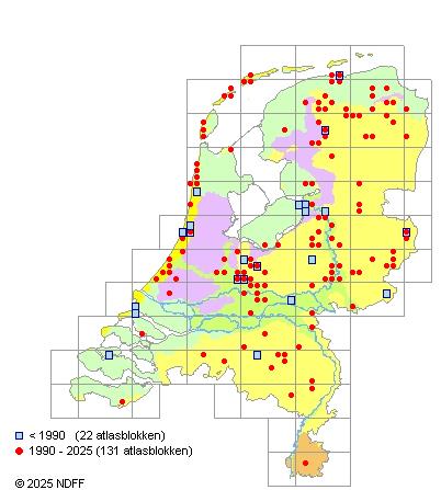 Het aantal atlasblokken (5x5 km) waarin de soort is gemeld binnen een periode van vijf jaar (vanaf 1980) of twintig jaar. Niet gecorrigeerd voor waarnemersinspanning en het aantal doorgegeven waarnemingen kan sterk variëren per periode, dus een trend in verspreiding kan hier niet direct uit worden afgelezen. Het opgegeven jaartal is het eerste jaar van de periode. Bron: gevalideerde waarnemingen uit de NDFF.