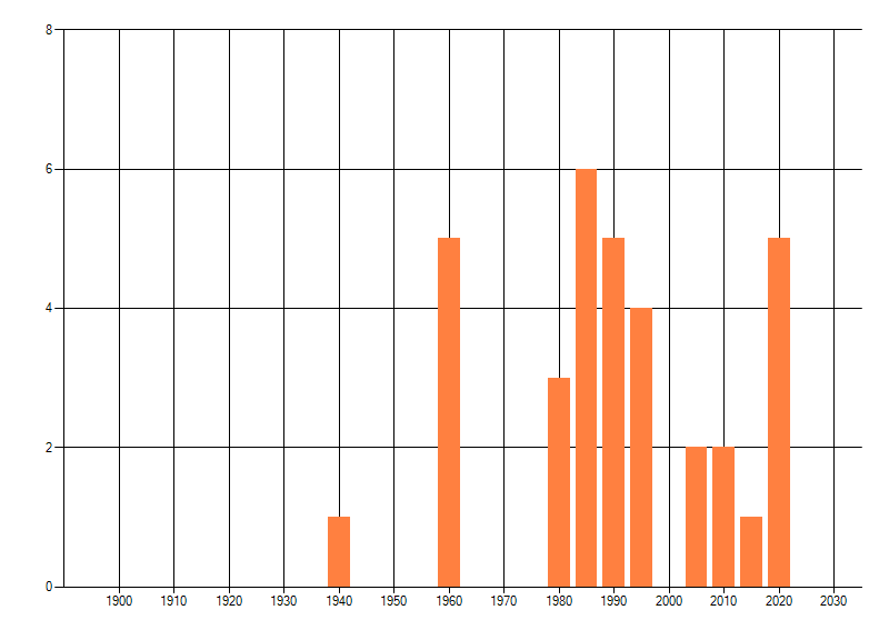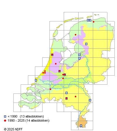 Het aantal atlasblokken (5x5 km) waarin de soort is gemeld binnen een periode van vijf jaar (vanaf 1980) of twintig jaar. Niet gecorrigeerd voor waarnemersinspanning en het aantal doorgegeven waarnemingen kan sterk variëren per periode, dus een trend in verspreiding kan hier niet direct uit worden afgelezen. Het opgegeven jaartal is het eerste jaar van de periode. Bron: gevalideerde waarnemingen uit de NDFF.