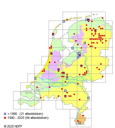 Het aantal atlasblokken (5x5 km) waarin de soort is gemeld binnen een periode van vijf jaar (vanaf 1980) of twintig jaar. Niet gecorrigeerd voor waarnemersinspanning en het aantal doorgegeven waarnemingen kan sterk variëren per periode, dus een trend in verspreiding kan hier niet direct uit worden afgelezen. Het opgegeven jaartal is het eerste jaar van de periode. Bron: gevalideerde waarnemingen uit de NDFF.