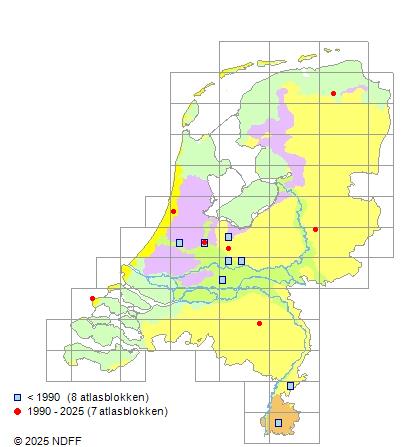 Het aantal atlasblokken (5x5 km) waarin de soort is gemeld binnen een periode van vijf jaar (vanaf 1980) of twintig jaar. Niet gecorrigeerd voor waarnemersinspanning en het aantal doorgegeven waarnemingen kan sterk variëren per periode, dus een trend in verspreiding kan hier niet direct uit worden afgelezen. Het opgegeven jaartal is het eerste jaar van de periode. Bron: gevalideerde waarnemingen uit de NDFF.