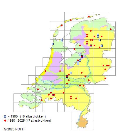 Het aantal atlasblokken (5x5 km) waarin de soort is gemeld binnen een periode van vijf jaar (vanaf 1980) of twintig jaar. Niet gecorrigeerd voor waarnemersinspanning en het aantal doorgegeven waarnemingen kan sterk variëren per periode, dus een trend in verspreiding kan hier niet direct uit worden afgelezen. Het opgegeven jaartal is het eerste jaar van de periode. Bron: gevalideerde waarnemingen uit de NDFF.
