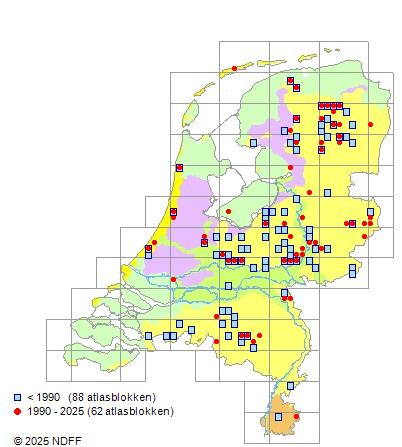 Het aantal atlasblokken (5x5 km) waarin de soort is gemeld binnen een periode van vijf jaar (vanaf 1980) of twintig jaar. Niet gecorrigeerd voor waarnemersinspanning en het aantal doorgegeven waarnemingen kan sterk variëren per periode, dus een trend in verspreiding kan hier niet direct uit worden afgelezen. Het opgegeven jaartal is het eerste jaar van de periode. Bron: gevalideerde waarnemingen uit de NDFF.