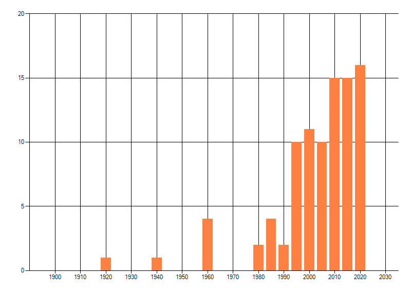 Het aantal atlasblokken (5x5 km) waarin de soort is gemeld binnen een periode van vijf jaar (vanaf 1980) of twintig jaar. Niet gecorrigeerd voor waarnemersinspanning en het aantal doorgegeven waarnemingen kan sterk variëren per periode, dus een trend in verspreiding kan hier niet direct uit worden afgelezen. Het opgegeven jaartal is het eerste jaar van de periode. Bron: gevalideerde waarnemingen uit de NDFF.