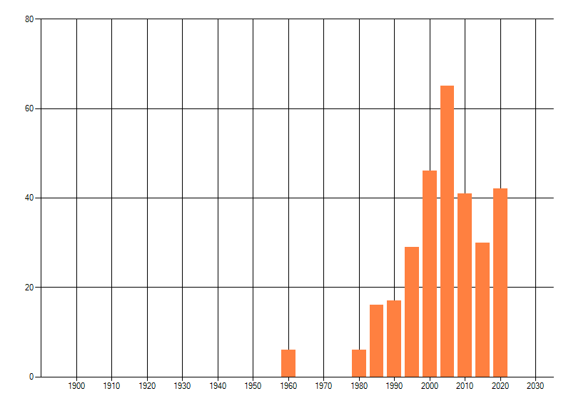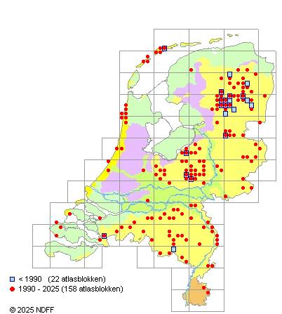 Het aantal atlasblokken (5x5 km) waarin de soort is gemeld binnen een periode van vijf jaar (vanaf 1980) of twintig jaar. Niet gecorrigeerd voor waarnemersinspanning en het aantal doorgegeven waarnemingen kan sterk variëren per periode, dus een trend in verspreiding kan hier niet direct uit worden afgelezen. Het opgegeven jaartal is het eerste jaar van de periode. Bron: gevalideerde waarnemingen uit de NDFF.