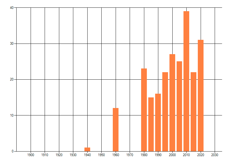 Het aantal atlasblokken (5x5 km) waarin de soort is gemeld binnen een periode van vijf jaar (vanaf 1980) of twintig jaar. Niet gecorrigeerd voor waarnemersinspanning en het aantal doorgegeven waarnemingen kan sterk variëren per periode, dus een trend in verspreiding kan hier niet direct uit worden afgelezen. Het opgegeven jaartal is het eerste jaar van de periode. Bron: gevalideerde waarnemingen uit de NDFF.