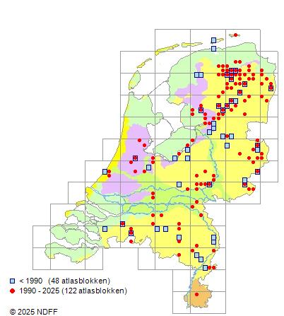 Het aantal atlasblokken (5x5 km) waarin de soort is gemeld binnen een periode van vijf jaar (vanaf 1980) of twintig jaar. Niet gecorrigeerd voor waarnemersinspanning en het aantal doorgegeven waarnemingen kan sterk variëren per periode, dus een trend in verspreiding kan hier niet direct uit worden afgelezen. Het opgegeven jaartal is het eerste jaar van de periode. Bron: gevalideerde waarnemingen uit de NDFF.