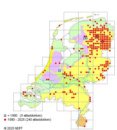 Het aantal atlasblokken (5x5 km) waarin de soort is gemeld binnen een periode van vijf jaar (vanaf 1980) of twintig jaar. Niet gecorrigeerd voor waarnemersinspanning en het aantal doorgegeven waarnemingen kan sterk variëren per periode, dus een trend in verspreiding kan hier niet direct uit worden afgelezen. Het opgegeven jaartal is het eerste jaar van de periode. Bron: gevalideerde waarnemingen uit de NDFF.