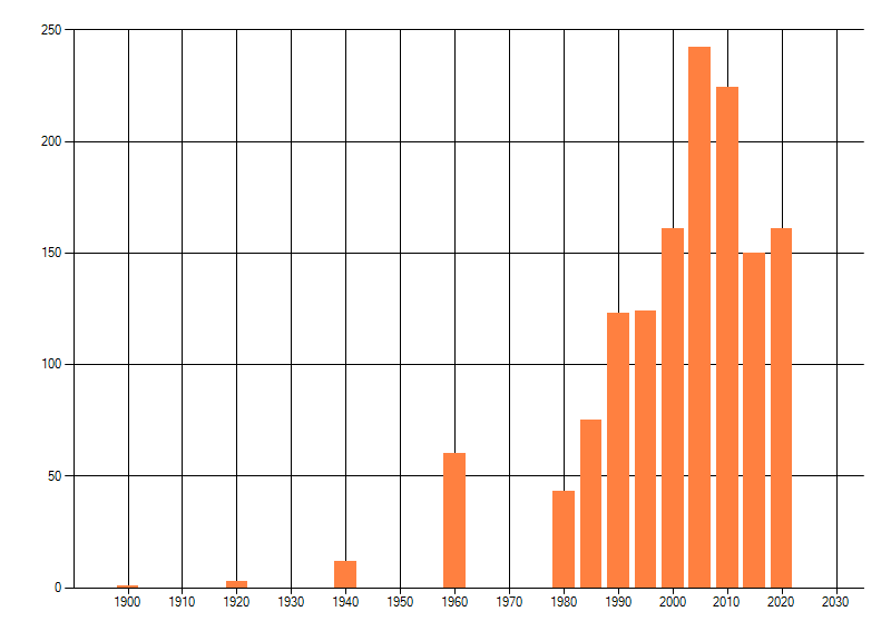Het aantal atlasblokken (5x5 km) waarin de soort is gemeld binnen een periode van vijf jaar (vanaf 1980) of twintig jaar. Niet gecorrigeerd voor waarnemersinspanning en het aantal doorgegeven waarnemingen kan sterk variëren per periode, dus een trend in verspreiding kan hier niet direct uit worden afgelezen. Het opgegeven jaartal is het eerste jaar van de periode. Bron: gevalideerde waarnemingen uit de NDFF.