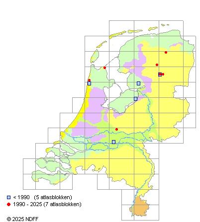Het aantal atlasblokken (5x5 km) waarin de soort is gemeld binnen een periode van vijf jaar (vanaf 1980) of twintig jaar. Niet gecorrigeerd voor waarnemersinspanning en het aantal doorgegeven waarnemingen kan sterk variëren per periode, dus een trend in verspreiding kan hier niet direct uit worden afgelezen. Het opgegeven jaartal is het eerste jaar van de periode. Bron: gevalideerde waarnemingen uit de NDFF.