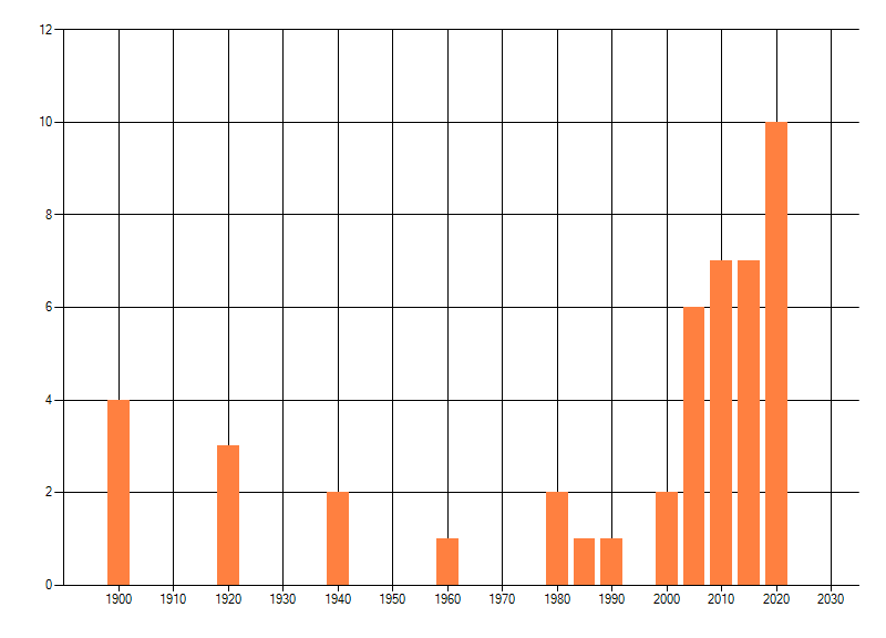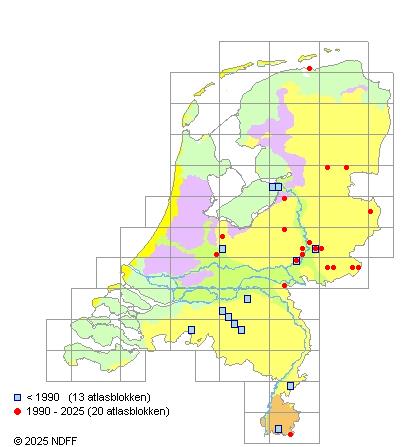 Het aantal atlasblokken (5x5 km) waarin de soort is gemeld binnen een periode van vijf jaar (vanaf 1980) of twintig jaar. Niet gecorrigeerd voor waarnemersinspanning en het aantal doorgegeven waarnemingen kan sterk variëren per periode, dus een trend in verspreiding kan hier niet direct uit worden afgelezen. Het opgegeven jaartal is het eerste jaar van de periode. Bron: gevalideerde waarnemingen uit de NDFF.