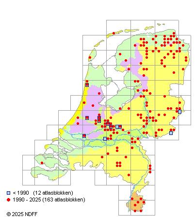 Het aantal atlasblokken (5x5 km) waarin de soort is gemeld binnen een periode van vijf jaar (vanaf 1980) of twintig jaar. Niet gecorrigeerd voor waarnemersinspanning en het aantal doorgegeven waarnemingen kan sterk variëren per periode, dus een trend in verspreiding kan hier niet direct uit worden afgelezen. Het opgegeven jaartal is het eerste jaar van de periode. Bron: gevalideerde waarnemingen uit de NDFF.