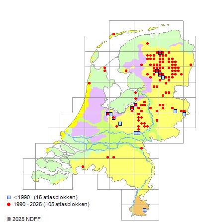 Het aantal atlasblokken (5x5 km) waarin de soort is gemeld binnen een periode van vijf jaar (vanaf 1980) of twintig jaar. Niet gecorrigeerd voor waarnemersinspanning en het aantal doorgegeven waarnemingen kan sterk variëren per periode, dus een trend in verspreiding kan hier niet direct uit worden afgelezen. Het opgegeven jaartal is het eerste jaar van de periode. Bron: gevalideerde waarnemingen uit de NDFF.