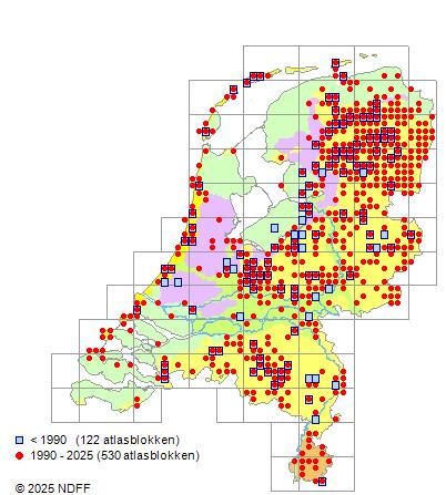 Het aantal atlasblokken (5x5 km) waarin de soort is gemeld binnen een periode van vijf jaar (vanaf 1980) of twintig jaar. Niet gecorrigeerd voor waarnemersinspanning en het aantal doorgegeven waarnemingen kan sterk variëren per periode, dus een trend in verspreiding kan hier niet direct uit worden afgelezen. Het opgegeven jaartal is het eerste jaar van de periode. Bron: gevalideerde waarnemingen uit de NDFF.