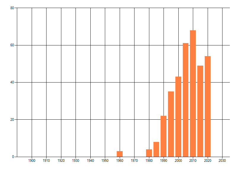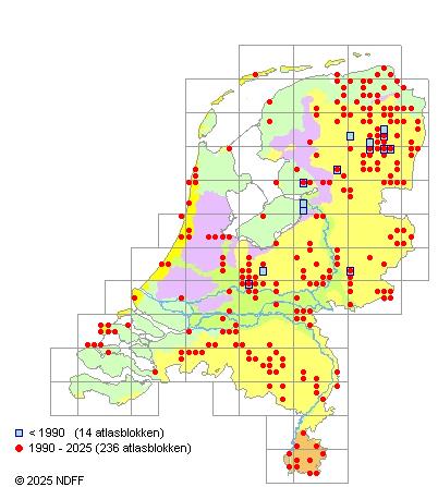 Het aantal atlasblokken (5x5 km) waarin de soort is gemeld binnen een periode van vijf jaar (vanaf 1980) of twintig jaar. Niet gecorrigeerd voor waarnemersinspanning en het aantal doorgegeven waarnemingen kan sterk variëren per periode, dus een trend in verspreiding kan hier niet direct uit worden afgelezen. Het opgegeven jaartal is het eerste jaar van de periode. Bron: gevalideerde waarnemingen uit de NDFF.