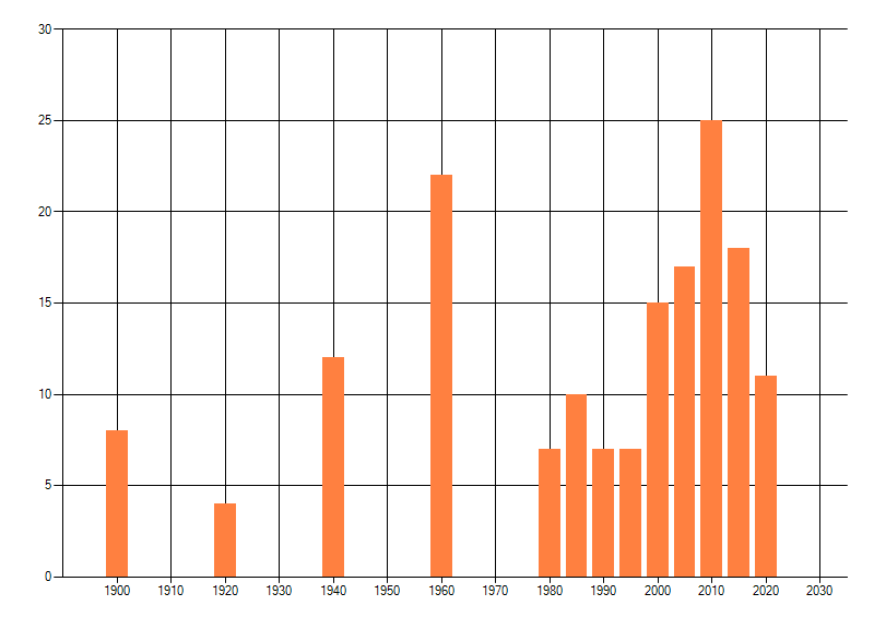 Het aantal atlasblokken (5x5 km) waarin de soort is gemeld binnen een periode van vijf jaar (vanaf 1980) of twintig jaar. Niet gecorrigeerd voor waarnemersinspanning en het aantal doorgegeven waarnemingen kan sterk variëren per periode, dus een trend in verspreiding kan hier niet direct uit worden afgelezen. Het opgegeven jaartal is het eerste jaar van de periode. Bron: gevalideerde waarnemingen uit de NDFF.