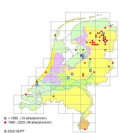 Het aantal atlasblokken (5x5 km) waarin de soort is gemeld binnen een periode van vijf jaar (vanaf 1980) of twintig jaar. Niet gecorrigeerd voor waarnemersinspanning en het aantal doorgegeven waarnemingen kan sterk variëren per periode, dus een trend in verspreiding kan hier niet direct uit worden afgelezen. Het opgegeven jaartal is het eerste jaar van de periode. Bron: gevalideerde waarnemingen uit de NDFF.
