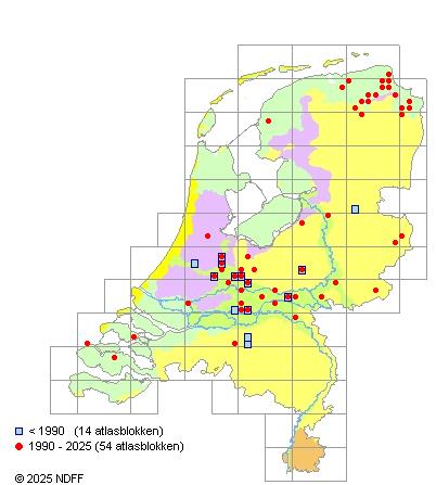 Het aantal atlasblokken (5x5 km) waarin de soort is gemeld binnen een periode van vijf jaar (vanaf 1980) of twintig jaar. Niet gecorrigeerd voor waarnemersinspanning en het aantal doorgegeven waarnemingen kan sterk variëren per periode, dus een trend in verspreiding kan hier niet direct uit worden afgelezen. Het opgegeven jaartal is het eerste jaar van de periode. Bron: gevalideerde waarnemingen uit de NDFF.