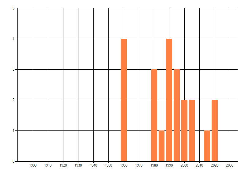 Het aantal atlasblokken (5x5 km) waarin de soort is gemeld binnen een periode van vijf jaar (vanaf 1980) of twintig jaar. Niet gecorrigeerd voor waarnemersinspanning en het aantal doorgegeven waarnemingen kan sterk variëren per periode, dus een trend in verspreiding kan hier niet direct uit worden afgelezen. Het opgegeven jaartal is het eerste jaar van de periode. Bron: gevalideerde waarnemingen uit de NDFF.