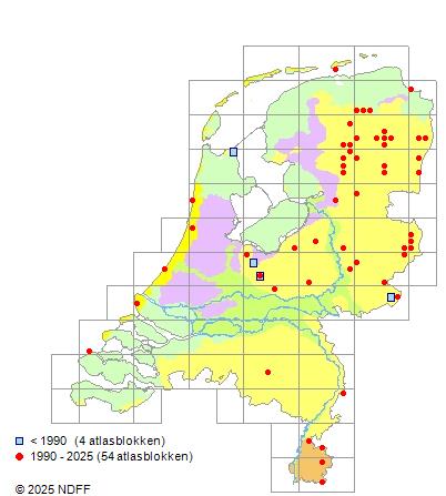 Het aantal atlasblokken (5x5 km) waarin de soort is gemeld binnen een periode van vijf jaar (vanaf 1980) of twintig jaar. Niet gecorrigeerd voor waarnemersinspanning en het aantal doorgegeven waarnemingen kan sterk variëren per periode, dus een trend in verspreiding kan hier niet direct uit worden afgelezen. Het opgegeven jaartal is het eerste jaar van de periode. Bron: gevalideerde waarnemingen uit de NDFF.