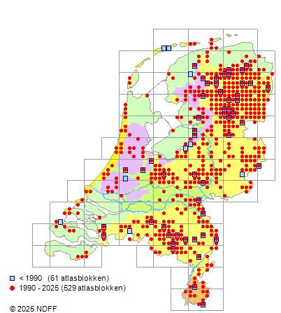 Het aantal atlasblokken (5x5 km) waarin de soort is gemeld binnen een periode van vijf jaar (vanaf 1980) of twintig jaar. Niet gecorrigeerd voor waarnemersinspanning en het aantal doorgegeven waarnemingen kan sterk variëren per periode, dus een trend in verspreiding kan hier niet direct uit worden afgelezen. Het opgegeven jaartal is het eerste jaar van de periode. Bron: gevalideerde waarnemingen uit de NDFF.