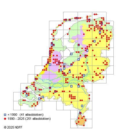 Het aantal atlasblokken (5x5 km) waarin de soort is gemeld binnen een periode van vijf jaar (vanaf 1980) of twintig jaar. Niet gecorrigeerd voor waarnemersinspanning en het aantal doorgegeven waarnemingen kan sterk variëren per periode, dus een trend in verspreiding kan hier niet direct uit worden afgelezen. Het opgegeven jaartal is het eerste jaar van de periode. Bron: gevalideerde waarnemingen uit de NDFF.