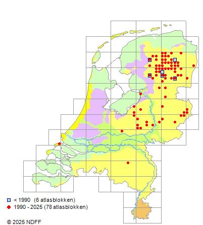Het aantal atlasblokken (5x5 km) waarin de soort is gemeld binnen een periode van vijf jaar (vanaf 1980) of twintig jaar. Niet gecorrigeerd voor waarnemersinspanning en het aantal doorgegeven waarnemingen kan sterk variëren per periode, dus een trend in verspreiding kan hier niet direct uit worden afgelezen. Het opgegeven jaartal is het eerste jaar van de periode. Bron: gevalideerde waarnemingen uit de NDFF.