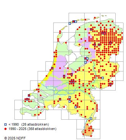Het aantal atlasblokken (5x5 km) waarin de soort is gemeld binnen een periode van vijf jaar (vanaf 1980) of twintig jaar. Niet gecorrigeerd voor waarnemersinspanning en het aantal doorgegeven waarnemingen kan sterk variëren per periode, dus een trend in verspreiding kan hier niet direct uit worden afgelezen. Het opgegeven jaartal is het eerste jaar van de periode. Bron: gevalideerde waarnemingen uit de NDFF.