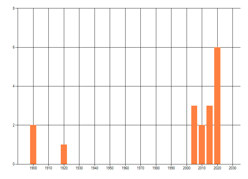 Het aantal atlasblokken (5x5 km) waarin de soort is gemeld binnen een periode van vijf jaar (vanaf 1980) of twintig jaar. Niet gecorrigeerd voor waarnemersinspanning en het aantal doorgegeven waarnemingen kan sterk variëren per periode, dus een trend in verspreiding kan hier niet direct uit worden afgelezen. Het opgegeven jaartal is het eerste jaar van de periode. Bron: gevalideerde waarnemingen uit de NDFF.