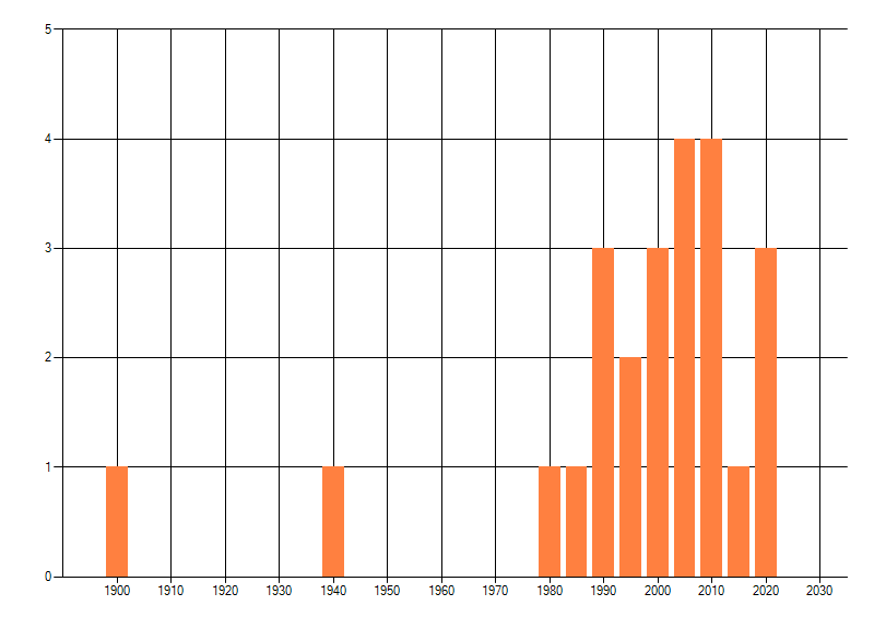 Het aantal atlasblokken (5x5 km) waarin de soort is gemeld binnen een periode van vijf jaar (vanaf 1980) of twintig jaar. Niet gecorrigeerd voor waarnemersinspanning en het aantal doorgegeven waarnemingen kan sterk variëren per periode, dus een trend in verspreiding kan hier niet direct uit worden afgelezen. Het opgegeven jaartal is het eerste jaar van de periode. Bron: gevalideerde waarnemingen uit de NDFF.