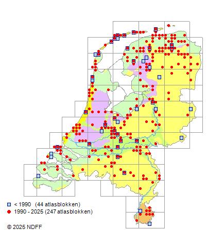 Het aantal atlasblokken (5x5 km) waarin de soort is gemeld binnen een periode van vijf jaar (vanaf 1980) of twintig jaar. Niet gecorrigeerd voor waarnemersinspanning en het aantal doorgegeven waarnemingen kan sterk variëren per periode, dus een trend in verspreiding kan hier niet direct uit worden afgelezen. Het opgegeven jaartal is het eerste jaar van de periode. Bron: gevalideerde waarnemingen uit de NDFF.