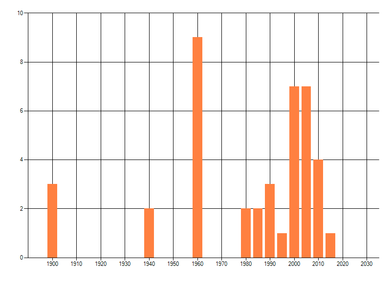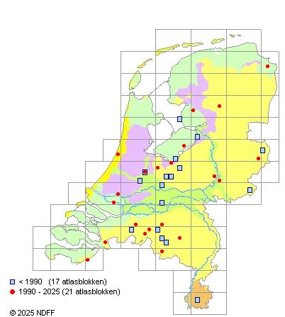 Het aantal atlasblokken (5x5 km) waarin de soort is gemeld binnen een periode van vijf jaar (vanaf 1980) of twintig jaar. Niet gecorrigeerd voor waarnemersinspanning en het aantal doorgegeven waarnemingen kan sterk variëren per periode, dus een trend in verspreiding kan hier niet direct uit worden afgelezen. Het opgegeven jaartal is het eerste jaar van de periode. Bron: gevalideerde waarnemingen uit de NDFF.