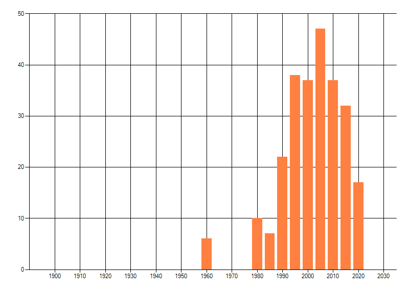 Het aantal atlasblokken (5x5 km) waarin de soort is gemeld binnen een periode van vijf jaar (vanaf 1980) of twintig jaar. Niet gecorrigeerd voor waarnemersinspanning en het aantal doorgegeven waarnemingen kan sterk variëren per periode, dus een trend in verspreiding kan hier niet direct uit worden afgelezen. Het opgegeven jaartal is het eerste jaar van de periode. Bron: gevalideerde waarnemingen uit de NDFF.