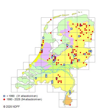 Het aantal atlasblokken (5x5 km) waarin de soort is gemeld binnen een periode van vijf jaar (vanaf 1980) of twintig jaar. Niet gecorrigeerd voor waarnemersinspanning en het aantal doorgegeven waarnemingen kan sterk variëren per periode, dus een trend in verspreiding kan hier niet direct uit worden afgelezen. Het opgegeven jaartal is het eerste jaar van de periode. Bron: gevalideerde waarnemingen uit de NDFF.