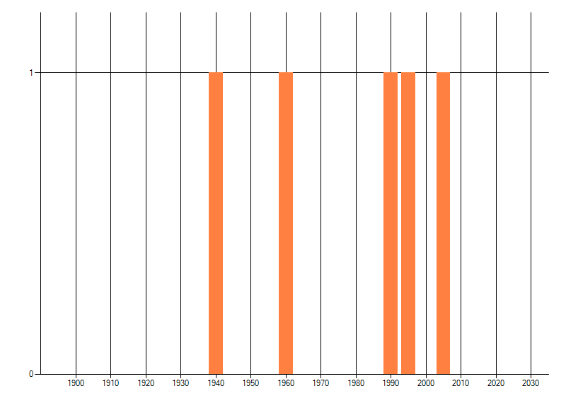 Het aantal atlasblokken (5x5 km) waarin de soort is gemeld binnen een periode van vijf jaar (vanaf 1980) of twintig jaar. Niet gecorrigeerd voor waarnemersinspanning en het aantal doorgegeven waarnemingen kan sterk variëren per periode, dus een trend in verspreiding kan hier niet direct uit worden afgelezen. Het opgegeven jaartal is het eerste jaar van de periode. Bron: gevalideerde waarnemingen uit de NDFF.