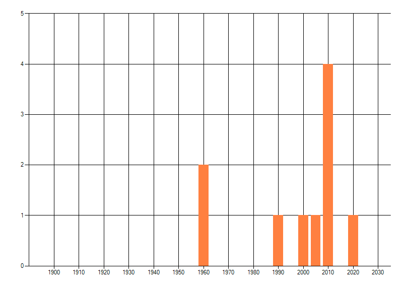 Het aantal atlasblokken (5x5 km) waarin de soort is gemeld binnen een periode van vijf jaar (vanaf 1980) of twintig jaar. Niet gecorrigeerd voor waarnemersinspanning en het aantal doorgegeven waarnemingen kan sterk variëren per periode, dus een trend in verspreiding kan hier niet direct uit worden afgelezen. Het opgegeven jaartal is het eerste jaar van de periode. Bron: gevalideerde waarnemingen uit de NDFF.
