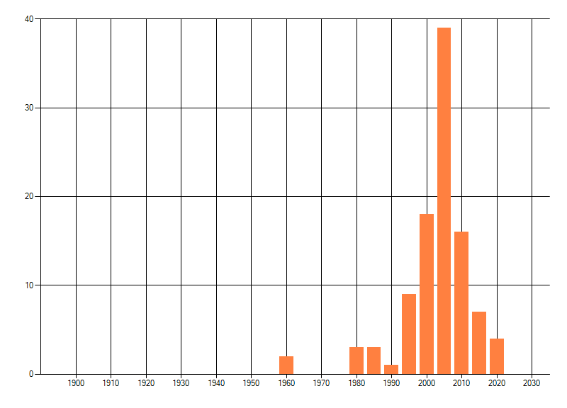 Het aantal atlasblokken (5x5 km) waarin de soort is gemeld binnen een periode van vijf jaar (vanaf 1980) of twintig jaar. Niet gecorrigeerd voor waarnemersinspanning en het aantal doorgegeven waarnemingen kan sterk variëren per periode, dus een trend in verspreiding kan hier niet direct uit worden afgelezen. Het opgegeven jaartal is het eerste jaar van de periode. Bron: gevalideerde waarnemingen uit de NDFF.
