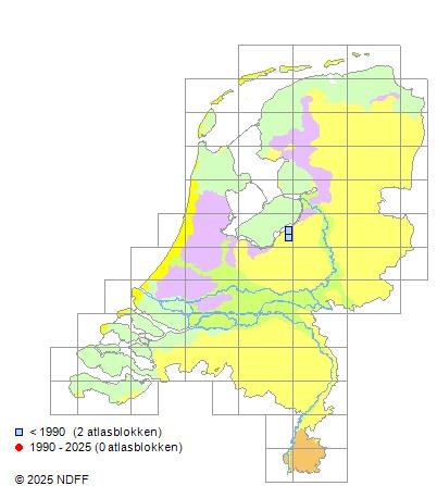 Het aantal atlasblokken (5x5 km) waarin de soort is gemeld binnen een periode van vijf jaar (vanaf 1980) of twintig jaar. Niet gecorrigeerd voor waarnemersinspanning en het aantal doorgegeven waarnemingen kan sterk variëren per periode, dus een trend in verspreiding kan hier niet direct uit worden afgelezen. Het opgegeven jaartal is het eerste jaar van de periode. Bron: gevalideerde waarnemingen uit de NDFF.