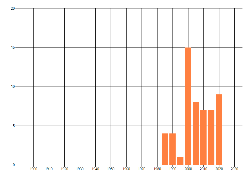 Het aantal atlasblokken (5x5 km) waarin de soort is gemeld binnen een periode van vijf jaar (vanaf 1980) of twintig jaar. Niet gecorrigeerd voor waarnemersinspanning en het aantal doorgegeven waarnemingen kan sterk variëren per periode, dus een trend in verspreiding kan hier niet direct uit worden afgelezen. Het opgegeven jaartal is het eerste jaar van de periode. Bron: gevalideerde waarnemingen uit de NDFF.