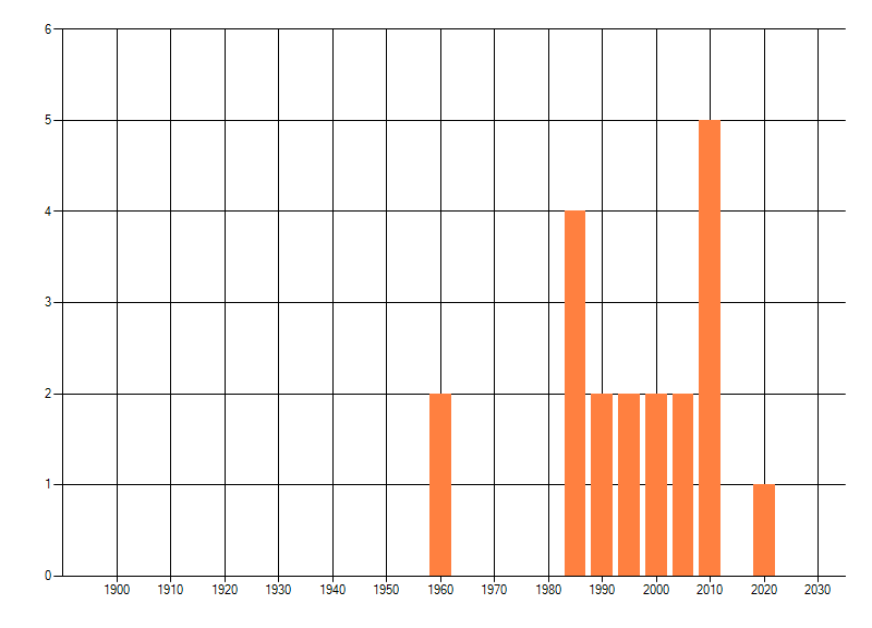 Het aantal atlasblokken (5x5 km) waarin de soort is gemeld binnen een periode van vijf jaar (vanaf 1980) of twintig jaar. Niet gecorrigeerd voor waarnemersinspanning en het aantal doorgegeven waarnemingen kan sterk variëren per periode, dus een trend in verspreiding kan hier niet direct uit worden afgelezen. Het opgegeven jaartal is het eerste jaar van de periode. Bron: gevalideerde waarnemingen uit de NDFF.