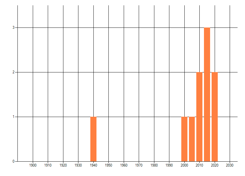 Het aantal atlasblokken (5x5 km) waarin de soort is gemeld binnen een periode van vijf jaar (vanaf 1980) of twintig jaar. Niet gecorrigeerd voor waarnemersinspanning en het aantal doorgegeven waarnemingen kan sterk variëren per periode, dus een trend in verspreiding kan hier niet direct uit worden afgelezen. Het opgegeven jaartal is het eerste jaar van de periode. Bron: gevalideerde waarnemingen uit de NDFF.