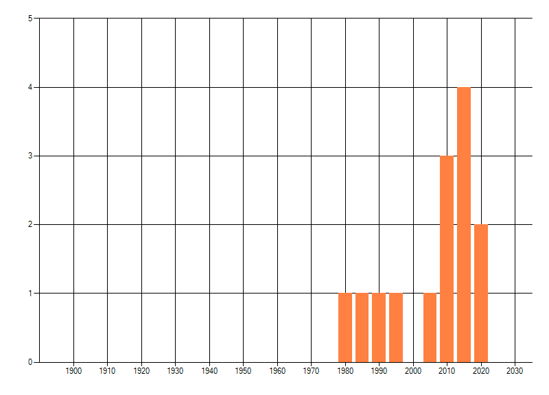 Het aantal atlasblokken (5x5 km) waarin de soort is gemeld binnen een periode van vijf jaar (vanaf 1980) of twintig jaar. Niet gecorrigeerd voor waarnemersinspanning en het aantal doorgegeven waarnemingen kan sterk variëren per periode, dus een trend in verspreiding kan hier niet direct uit worden afgelezen. Het opgegeven jaartal is het eerste jaar van de periode. Bron: gevalideerde waarnemingen uit de NDFF.