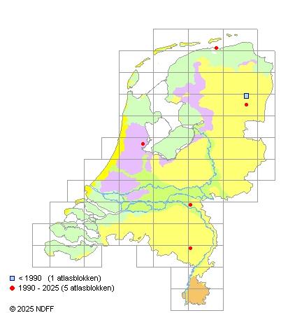 Het aantal atlasblokken (5x5 km) waarin de soort is gemeld binnen een periode van vijf jaar (vanaf 1980) of twintig jaar. Niet gecorrigeerd voor waarnemersinspanning en het aantal doorgegeven waarnemingen kan sterk variëren per periode, dus een trend in verspreiding kan hier niet direct uit worden afgelezen. Het opgegeven jaartal is het eerste jaar van de periode. Bron: gevalideerde waarnemingen uit de NDFF.