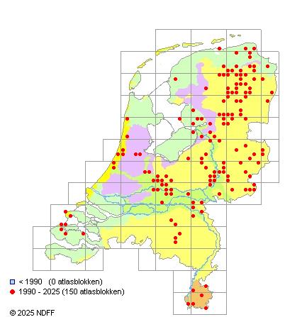 Het aantal atlasblokken (5x5 km) waarin de soort is gemeld binnen een periode van vijf jaar (vanaf 1980) of twintig jaar. Niet gecorrigeerd voor waarnemersinspanning en het aantal doorgegeven waarnemingen kan sterk variëren per periode, dus een trend in verspreiding kan hier niet direct uit worden afgelezen. Het opgegeven jaartal is het eerste jaar van de periode. Bron: gevalideerde waarnemingen uit de NDFF.