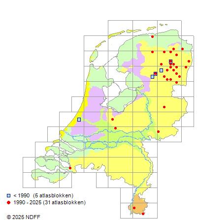 Het aantal atlasblokken (5x5 km) waarin de soort is gemeld binnen een periode van vijf jaar (vanaf 1980) of twintig jaar. Niet gecorrigeerd voor waarnemersinspanning en het aantal doorgegeven waarnemingen kan sterk variëren per periode, dus een trend in verspreiding kan hier niet direct uit worden afgelezen. Het opgegeven jaartal is het eerste jaar van de periode. Bron: gevalideerde waarnemingen uit de NDFF.