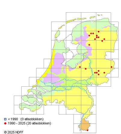Het aantal atlasblokken (5x5 km) waarin de soort is gemeld binnen een periode van vijf jaar (vanaf 1980) of twintig jaar. Niet gecorrigeerd voor waarnemersinspanning en het aantal doorgegeven waarnemingen kan sterk variëren per periode, dus een trend in verspreiding kan hier niet direct uit worden afgelezen. Het opgegeven jaartal is het eerste jaar van de periode. Bron: gevalideerde waarnemingen uit de NDFF.