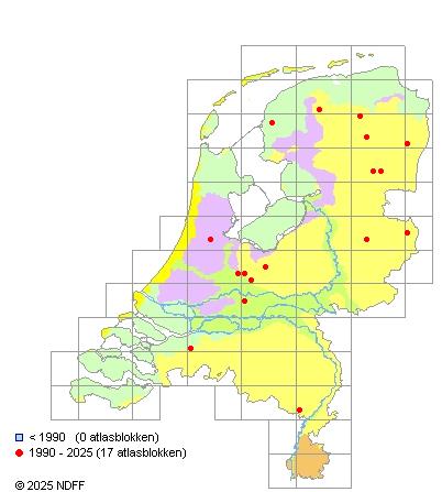 Het aantal atlasblokken (5x5 km) waarin de soort is gemeld binnen een periode van vijf jaar (vanaf 1980) of twintig jaar. Niet gecorrigeerd voor waarnemersinspanning en het aantal doorgegeven waarnemingen kan sterk variëren per periode, dus een trend in verspreiding kan hier niet direct uit worden afgelezen. Het opgegeven jaartal is het eerste jaar van de periode. Bron: gevalideerde waarnemingen uit de NDFF.