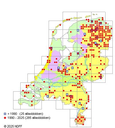 Het aantal atlasblokken (5x5 km) waarin de soort is gemeld binnen een periode van vijf jaar (vanaf 1980) of twintig jaar. Niet gecorrigeerd voor waarnemersinspanning en het aantal doorgegeven waarnemingen kan sterk variëren per periode, dus een trend in verspreiding kan hier niet direct uit worden afgelezen. Het opgegeven jaartal is het eerste jaar van de periode. Bron: gevalideerde waarnemingen uit de NDFF.