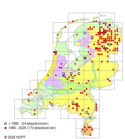Het aantal atlasblokken (5x5 km) waarin de soort is gemeld binnen een periode van vijf jaar (vanaf 1980) of twintig jaar. Niet gecorrigeerd voor waarnemersinspanning en het aantal doorgegeven waarnemingen kan sterk variëren per periode, dus een trend in verspreiding kan hier niet direct uit worden afgelezen. Het opgegeven jaartal is het eerste jaar van de periode. Bron: gevalideerde waarnemingen uit de NDFF.