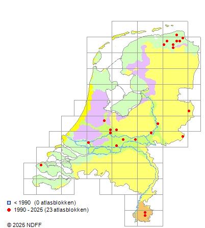 Het aantal atlasblokken (5x5 km) waarin de soort is gemeld binnen een periode van vijf jaar (vanaf 1980) of twintig jaar. Niet gecorrigeerd voor waarnemersinspanning en het aantal doorgegeven waarnemingen kan sterk variëren per periode, dus een trend in verspreiding kan hier niet direct uit worden afgelezen. Het opgegeven jaartal is het eerste jaar van de periode. Bron: gevalideerde waarnemingen uit de NDFF.