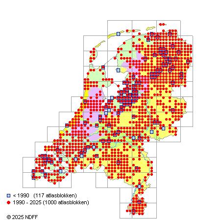 Het aantal atlasblokken (5x5 km) waarin de soort is gemeld binnen een periode van vijf jaar (vanaf 1980) of twintig jaar. Niet gecorrigeerd voor waarnemersinspanning en het aantal doorgegeven waarnemingen kan sterk variëren per periode, dus een trend in verspreiding kan hier niet direct uit worden afgelezen. Het opgegeven jaartal is het eerste jaar van de periode. Bron: gevalideerde waarnemingen uit de NDFF.